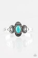 A refreshing turquoise stone is pressed into the center of a dainty silver cuff radiating with textured silver frames for a seasonal look.