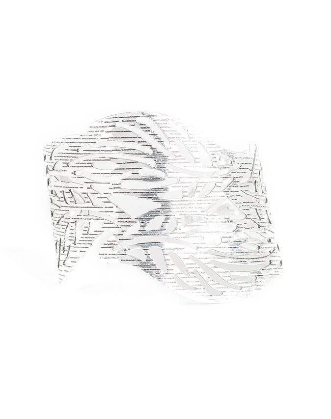Finely etched in linear patterns, a leafy silver cuff delicately wraps around the wrist for a statement-making seasonal finish.