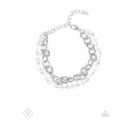 A strand of iridescent white crystal-like cube beading joins a classic strand of silver chain around the wrist, creating refined layers. Features an adjustable clasp closure.