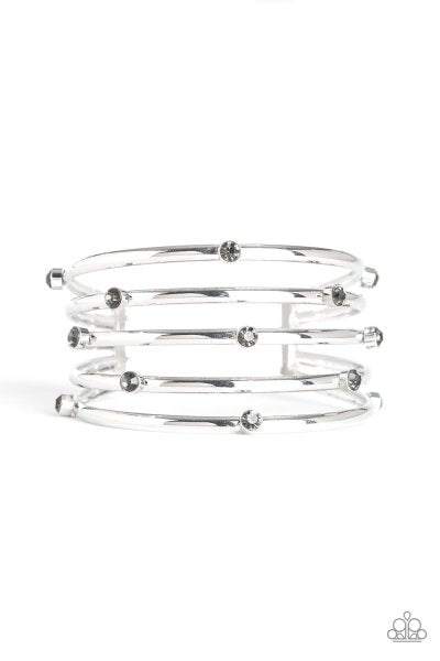 Sporadically dotted in glassy white rhinestones, thick silver bars stack across the wrist, coalescing into a statement-making cuff.